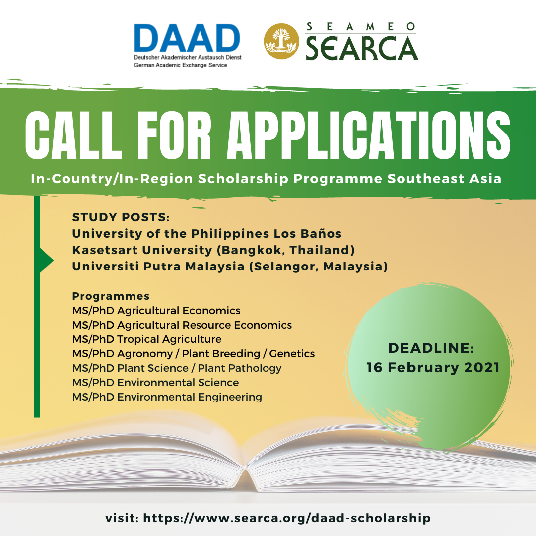 Đọc tiếpChương trình Học bổng DAAD-SEARCA trong nước / trong khu vực năm 2021-2022 với mục đích bồi dưỡng các hệ thống giáo dục đại học mạnh mẽ, theo định hướng năng lực quốc tế ở Đông Nam Á đóng góp vào sự phát triển bền vững. Có tối đa 46 học bổng mới sẽ được cấp cho các nghiên cứu Thạc sĩ hoặc Tiến sĩ liên quan đến phát triển cho những cá nhân có kế hoạch theo đuổi sự nghiệp giảng dạy và / hoặc nghiên cứu tại một cơ sở giáo dục đại học ở Đông Nam Á.